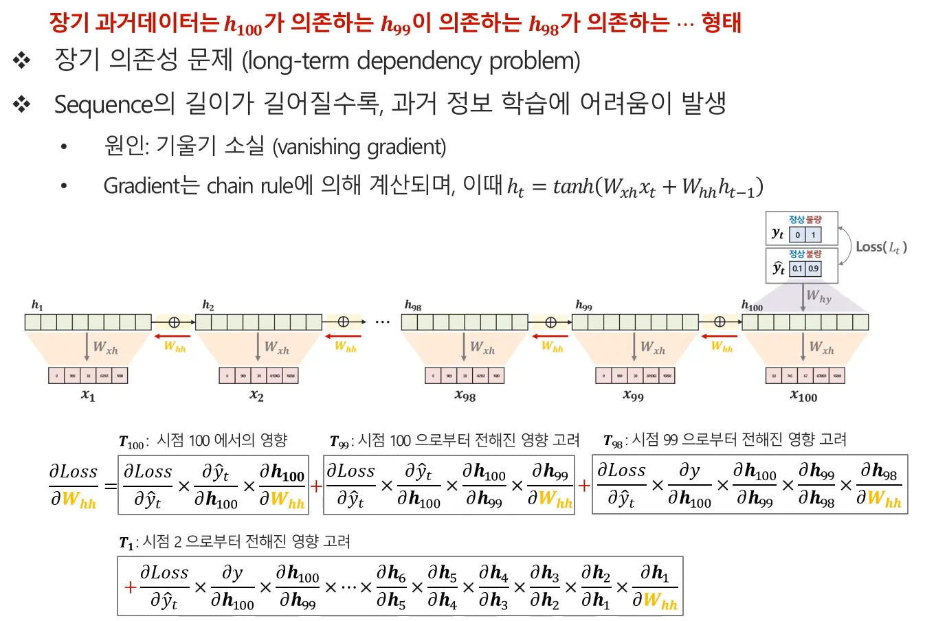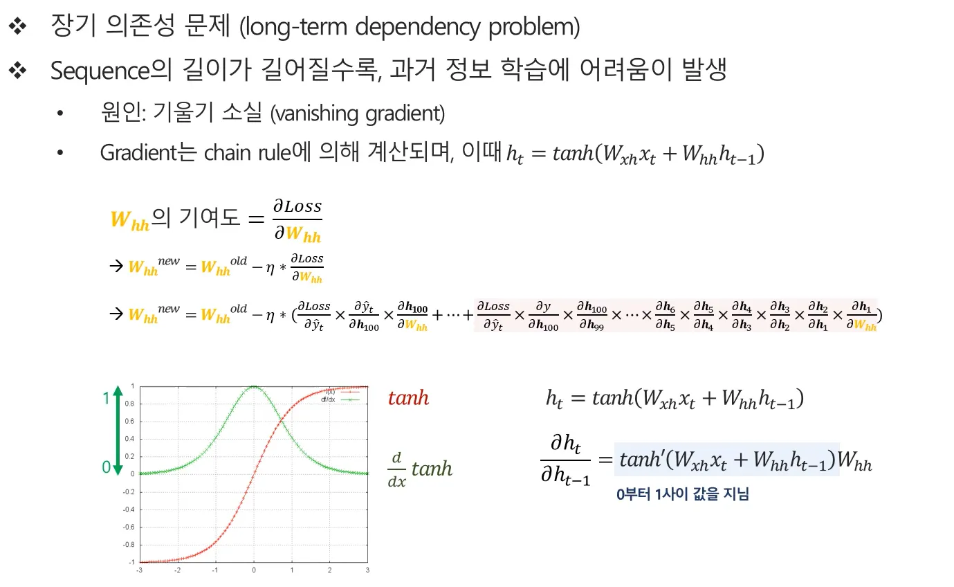 이처럼 시퀀스가 길어질수록 과거 정보의 영향이 사라지는 현상을 기울기 소실(vanishing gradient) 이라고 하며, 이는 RNN이 장기 의존성(long-term dependency)을 효과적으로 학습하지 못하는 구조적 한계로 이어집니다.