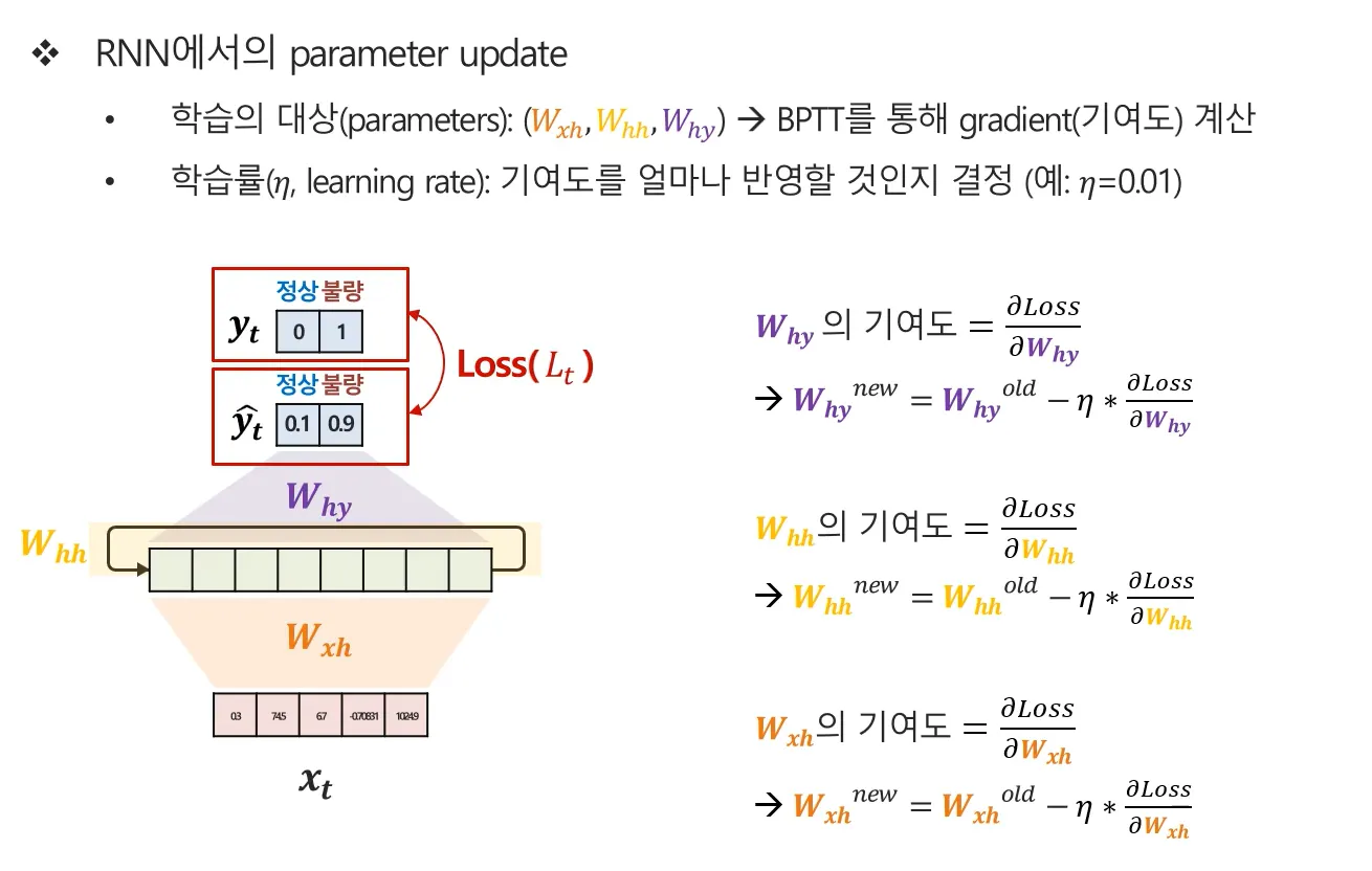 - RNN에서는 이 과정이 시간 축을 따라 진행되며, 이를 BPTT(Backpropagation Through Time)라고 합니다.