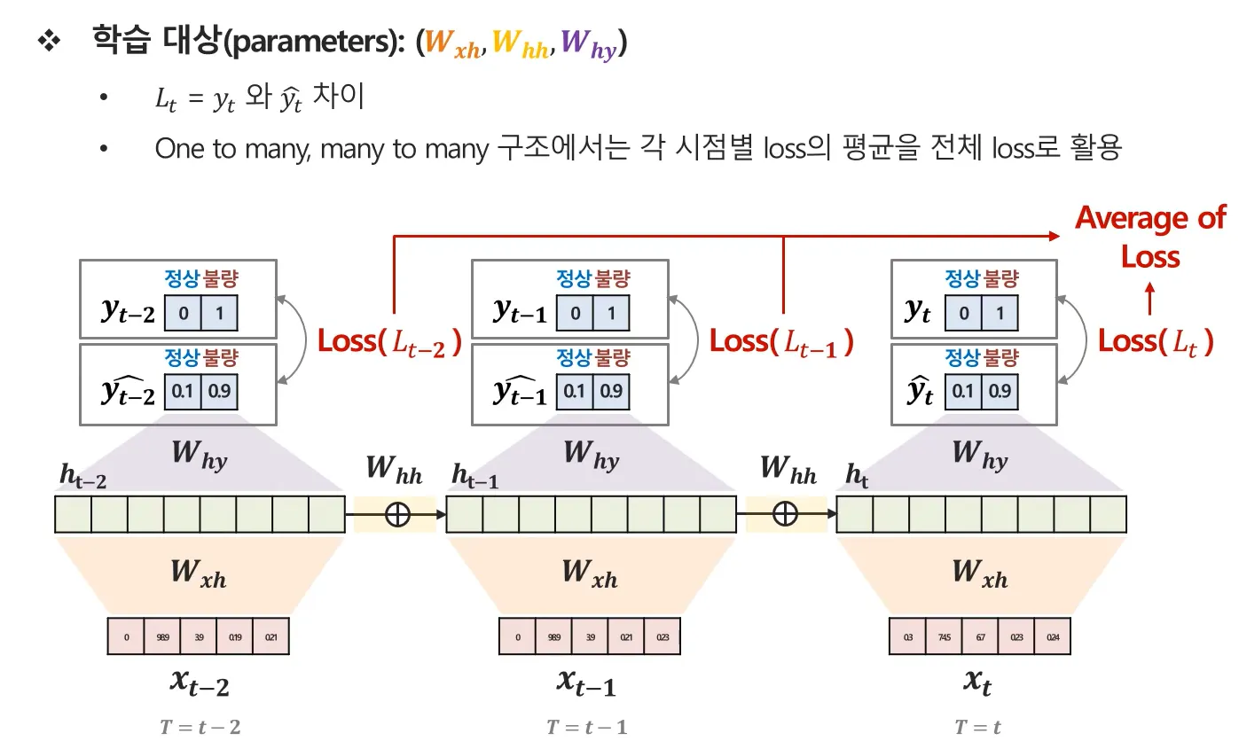 - 예측값 $\hat{\mathbf{y}}_t$와 실제값 $\mathbf{y}_t$ 차이로 Loss 계산