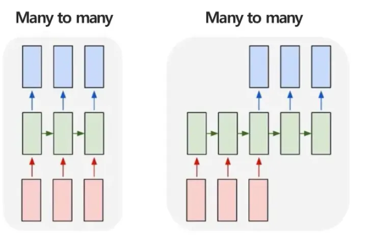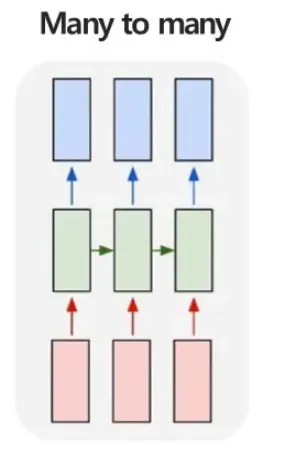 - 위에서 설명한 Many to many와는 다른 개념!(왼쪽 그림이 위에서 설명한 Many to many, 오른쪽 그림이 지금 설명하는 Many to many)
