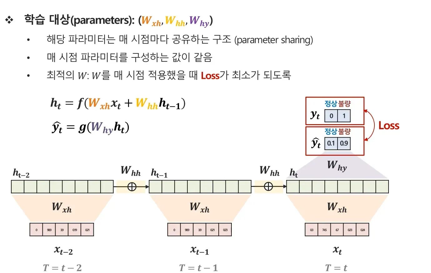 여기서 중요한 점은, 이 3개의 파라미터가 모든 시점에서 동일한 값을 공유한다는 것입니다. 즉, RNN은 parameter sharing 구조를 가정하고 있습니다.