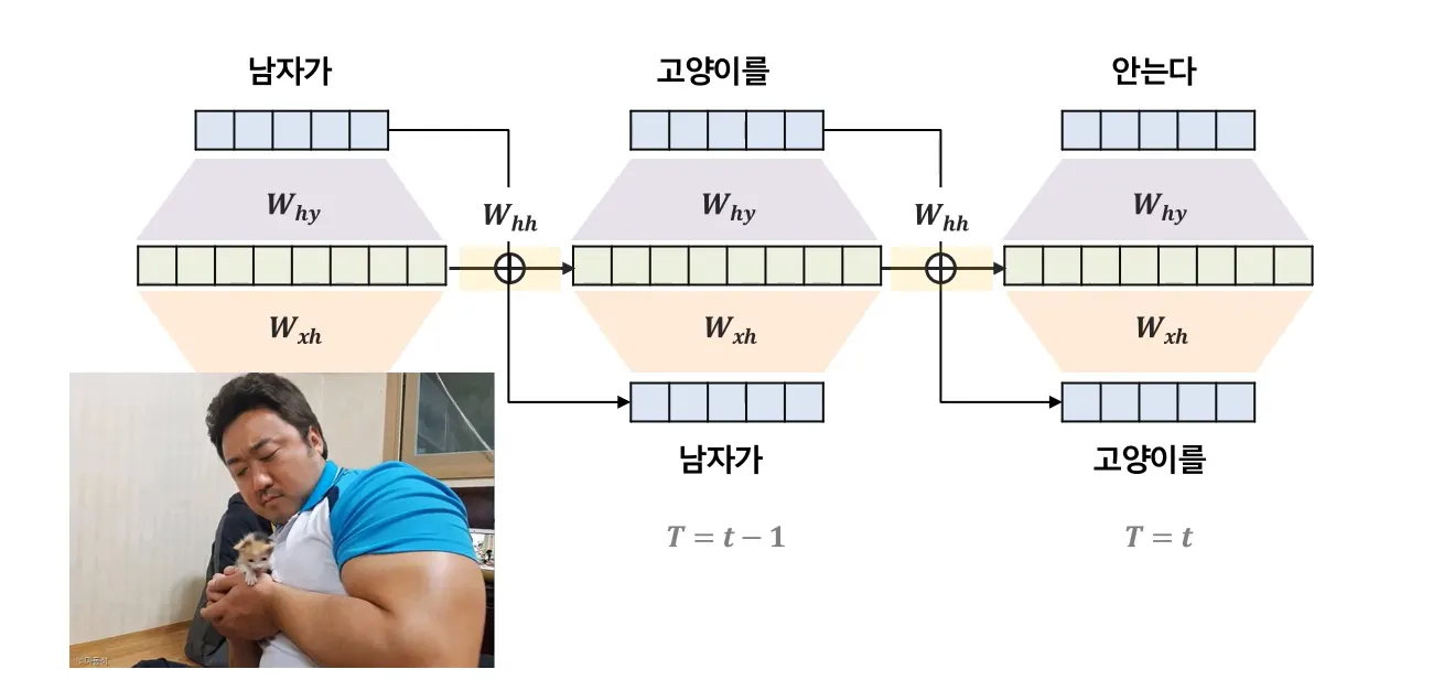 - t 시점 이전 정보 반영하는 파라미터 → $W_{hh}$