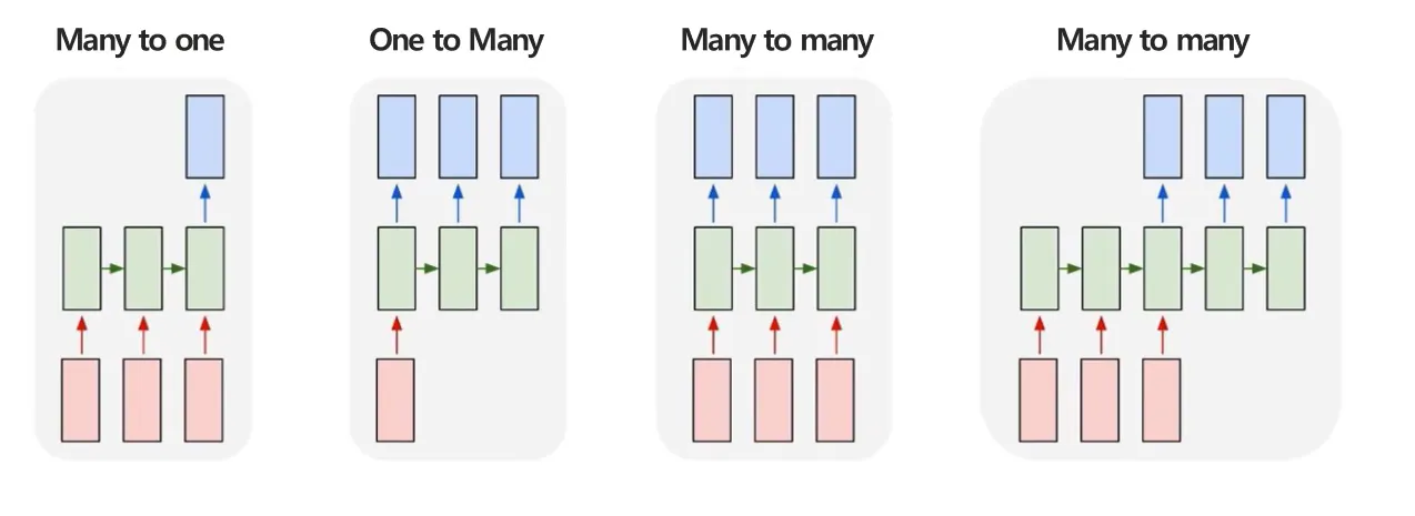 기존의 뉴럴네트워크는 One to One모델이었죠? 이제 그러면 RNN 구조의 종류를 한번 살펴보겠습니다.
