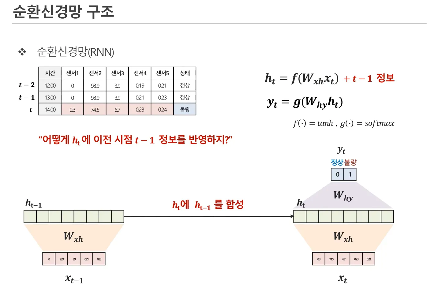 그림을 보시면, 이전 시점의 정보를 반영하기 위해 현재 시점의 은닉 상태 $h_t$는 $h_{t-1}$의 정보를 함께 입력받습니다. 이렇게 해야 이전 시점에서 학습된 정보가 현재 시점의 상태에 반영될 수 있습니다.