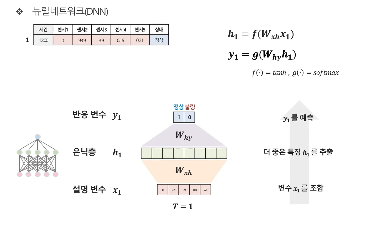 - 여기서는 가중치와 비선형 함수(tanh)를 통해 센서 값들의 관계를 학습하며, 이 과정을 통해 원래 입력보다 더 잘 구분되는 표현 $h_1$이 만들어집니다. $h_1$의 식은 아래와 같습니다.